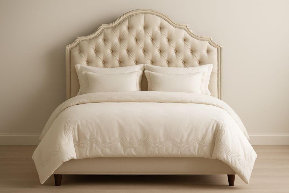 • Lit double 150x200 cm en pin massif, tête capitonnée crème