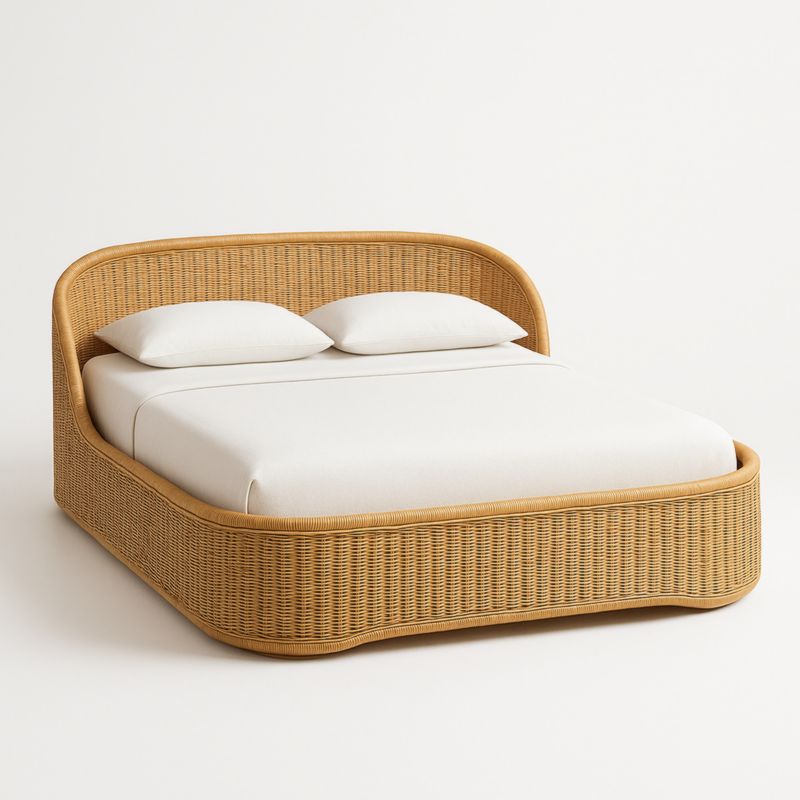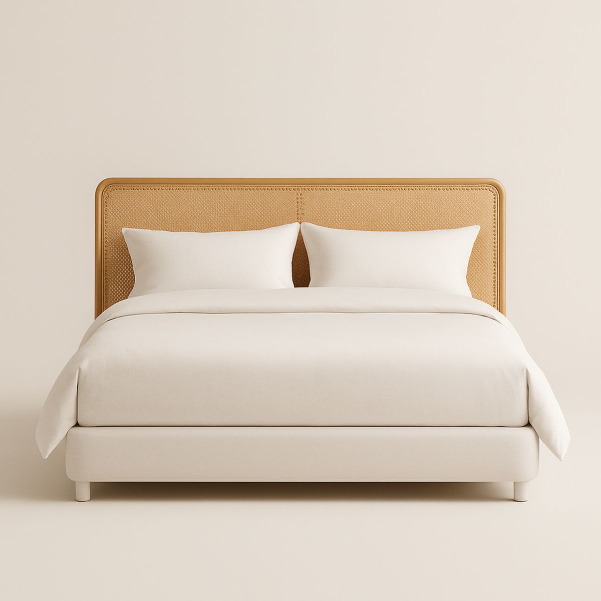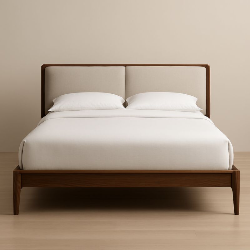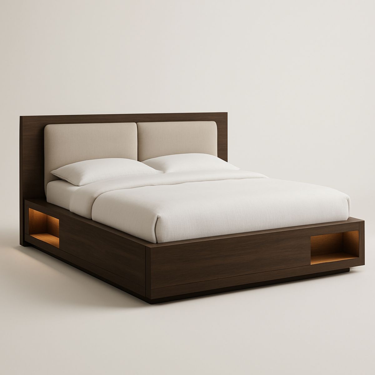 • Lit plateforme en bois marron avec tête de lit rembourrée en tissu beige
