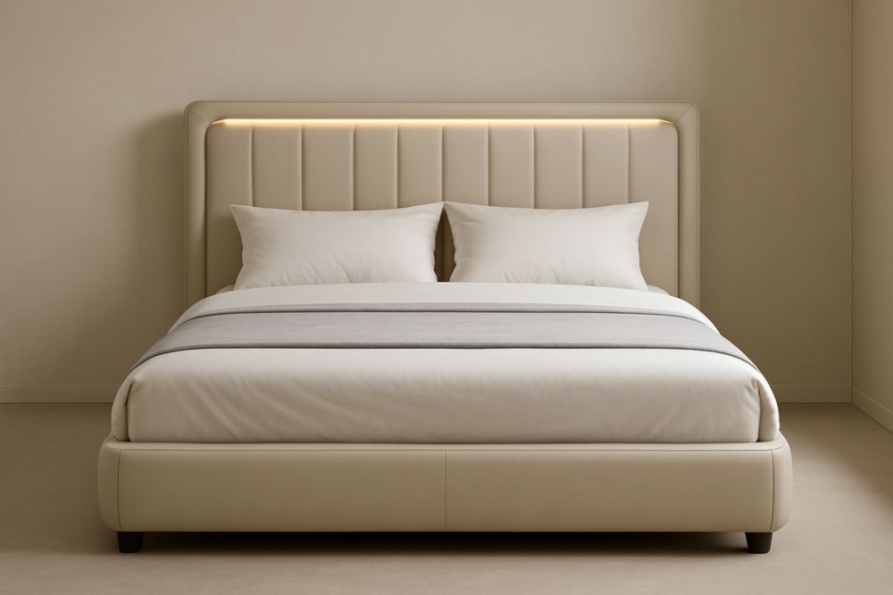 • Lit double en tissu beige avec tête de lit 200x180×120cm